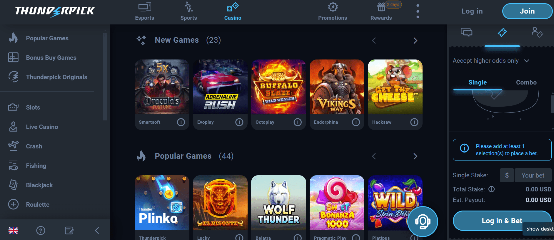 Thunderpick Casino bietet nicht nur eine Bibliothek mit Originalspielen, die vom Casino-Team erstellt wurden, sondern ist auch ein Kryptowährungs-Casino, das einige der bekanntesten Casinospiele von renommierten Entwicklern beherbergt. Da die hier aufgeführten Anbieter bekannte Marken wie Relax Gaming, BGaming, Yggdrasil, Push Gaming und Nolimit City umfassen, sollten die Spieler mit ihnen vertraut sein. Das Casino unterstützt sowohl Web- als auch Mobilplattformen und die Spieler haben die Möglichkeit, ihre gewünschte Sprache auszuwählen. Da das Casino vollständig lizenziert und von der Regierung von Curaçao beaufsichtigt wird, können sich die Spieler auch sicher fühlen.